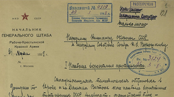 Iată un memorandum al șefului Statului Major General al Armatei Roșii, comandantul de armată, Boris Șapoșnikov, din 24 martie 1938, către comisarul popular al Apărării URSS și Mareșalul Uniunii Sovietice, Kliment Voroșilov, referitor la situația politică actuală din Europa și din Extremul Orient. Gradul de secretizare și de importanță a documentului este accentuat prin faptul că Boris Șapoșnikov nu recurge la ajutorul unei secretare dactilografe, ci scrie, singur, un raport de 31 de pagini. Acesta conține o evaluare a amenințării militare pe care o pot reprezenta diverse state atât în mod independent, cât și ca parte a alianțelor și blocurilor militare.