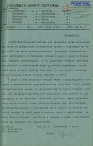 24 ianuarie 1938. Telegrama cifrată a împuternicitului de afaceri al URSS în Germania, G. A. Astahov către Comisariatul Poporului pentru Afaceri Externe al URSS cu supozițiile privind acțiunile României în cazul izbucnirii războiului în Europa/ Foto de arhivă