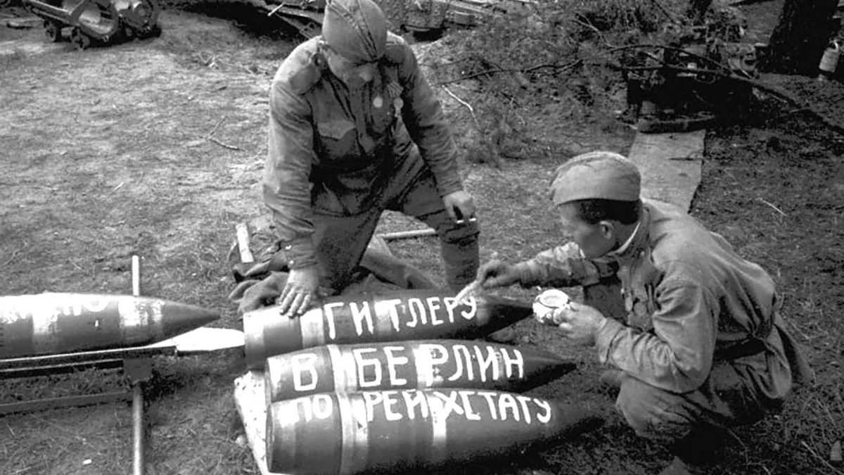 Faza finală a războiului. Soldații sovietici înscripționează adresele simbolice de destinație: Hitler, Berlin, Reichstag/ Foto de arhivă