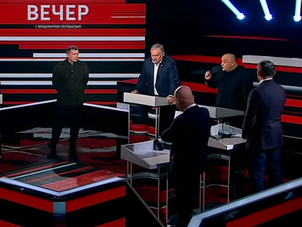 Populara emisiune a postului TV ”Rossia-1” ”O seară cu Vladimir Soloviov” care îi adună laolaltă, aproape fiecare seară, pe politologi, experți și jurnaliști pentru discuții pe teme politice de actualitate. În imagine (cel din stânga) telejurnalistul și moderatorul emisiunii, Vladimir Soloviov/ Foto: zatulin.ru