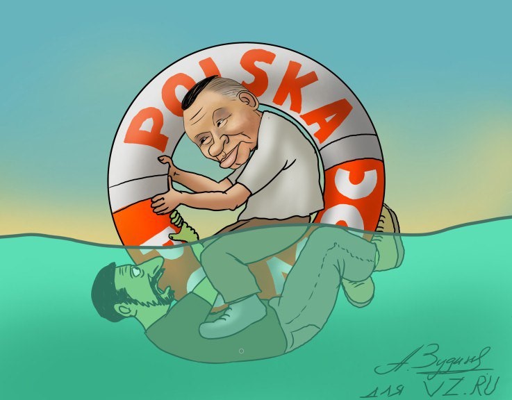 „Ucraina este ca un om care se îneacă și se agață de orice și amenință că îi va îneca pe cei care vor să-l ajute”, spune președintele polonez Andrzej Duda/ Desen: Vzgliad