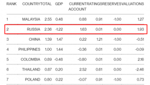 În alcătuirea listei s-a ținut cont de următorii indicatori: creșterea Produsului Intern Brut în 2018 și 2019, ratingul suveran de creditare, rezervele valutare, piața de acțiuni și obligațiuni. Însumate, cele trei elemente au generat un punctaj global de 2,36, permițând Rusiei să se ridice în clasament.