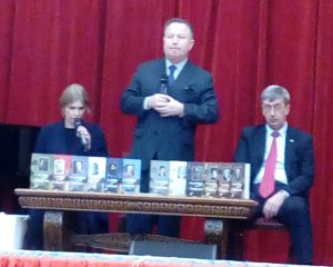 Președintele Fundației Valeri Alexeev prezinta colecția de carte ”Scriitorii ruși și ortodoxia”. În dreapta, Ambasadorul Federației Ruse în București, Valeri Kuzmin