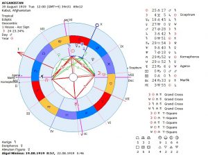 Din punct de vedere astral, Afganistanul este Leu (data naşterii este 19.08.1919) cu Ascendent în Scorpion. Structură puternică, graţie căreia a rezistat (cel puţin până acum) încercărilor deloc puţine sau uşoare. Opoziţia dintre conjuncţia Soare/ Saturn (conducătorul, guvernul, puterea, autoritatea, legile) şi Uranus exprimă cel mai bine permanenta schimbare şi oscilarea între tradiţie şi modern, conservatorism şi evoluţie. Soarele afectat mai indică şi existenţa inamicilor, mulţi şi puternici (vezi imperiile care au râvnit, în decursul istoriei, la această ţară).