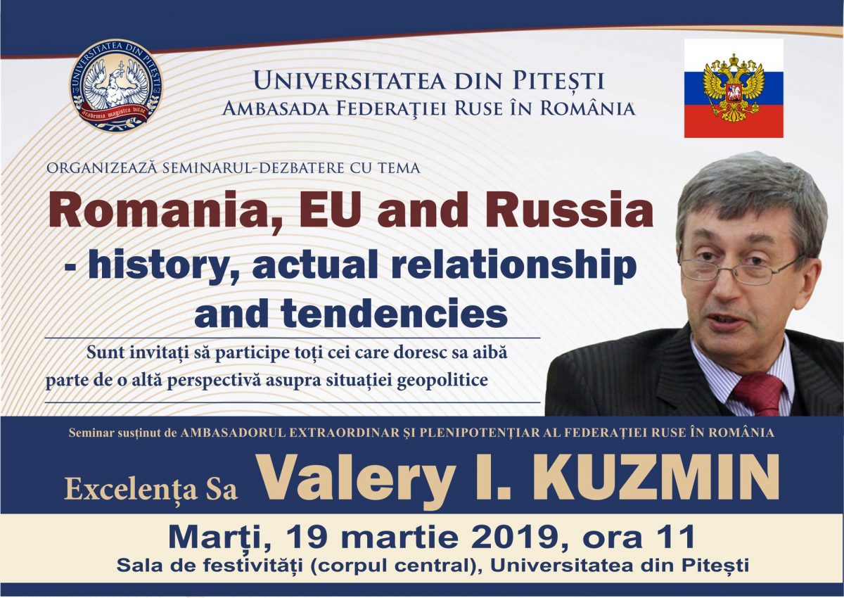 Astăzi, la Universitatea din Pitești (UPIT) are loc seminarul – dezbatere cu tema „România, UE, Rusia – istorie, relațiile actuale și tendințe”. Conferențiarul invitat să prezideze acest seminar este Valeri Kuzmin, Ambasador Extraordinar şi Plenipotențiar al Federației Ruse în România.