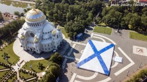 Cu ocazia sărbătorii, în insula Kronștadt, fortăreață a Flotei Militare Ruse, a fost desfășurat un imens steag ”Sf.Andrei” (în foto) care, începând din timpul lui Petru Cel Mare, a devenit principalul simbol al puterii maritime ruse. Steagul are dimensiunea de 65 X 43 m².