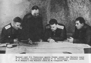 August 1944. Membrii Consiliului militar al celui de-al 2-lea Front Ucrainean (de la dreapta la stânga): I. Susaikov, R.Malinovski (comandant al Frontului), M.Zaharov (șef al Statului Major) și Stahurski/ Foto din Arhiva Minisreul Apărării al Rusiei