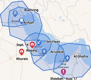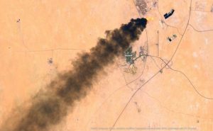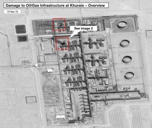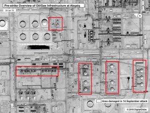 20 de drone și cel puțin o rachetă de croazieră, din Yemen. Pentru amorul artei, racheta de croazieră este și ea o dronă cu motor reactiv. Țintele au fost rafinăria Abqaiq și instalația petrolieră Khurais ale companiei Aramco, rezultatul fiind incendierea obiectivelor și întreruperea livrării de gaz și de petrol, pe o perioadă nedeterminată (v.foto 1, 2, 3).