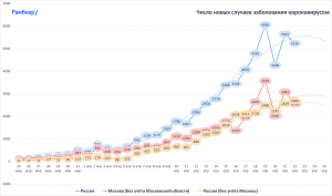 Graficele de răspândire a Covid-19 în Rusia, prezentând numărul de îmbolnăviri în fiecare zi: în Rusia, per total (culoarea albastră), la Moscova (culoarea roșie) și în Rusia, fără Moscova (culoarea galbenă)/ Foto: rambler.ru