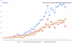 Graficele de răspândire a Covid-19 în Rusia, prezentând numărul de îmbolnăviri în fiecare zi: în Rusia, per total (culoarea albastră), la Moscova (culoarea roșie) și în Rusia, fără Moscova (culoarea galbenă)/ Foto: rambler.ru
