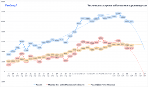 Graficele de răspândire a Covid-19 în Rusia, prezentând numărul de îmbolnăviri în fiecare zi: în Rusia, per total (culoarea albastră), la Moscova (culoarea roșie) și în Rusia, fără Moscova (culoarea galbenă)/ Foto: rambler.ru