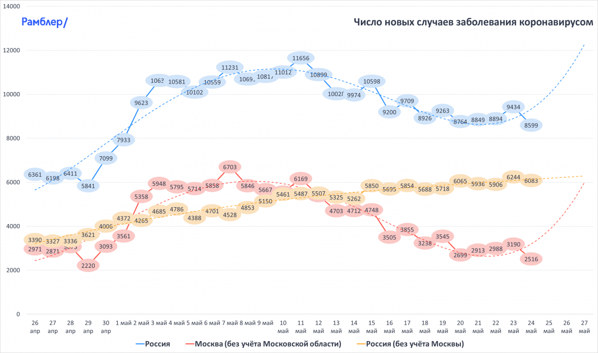 Graficele de răspândire a Covid-19 în Rusia, prezentând numărul de îmbolnăviri în fiecare zi: în Rusia, per total (culoarea albastră), la Moscova (culoarea roșie) și în Rusia, fără Moscova (culoarea galbenă)/ Foto: rambler.ru