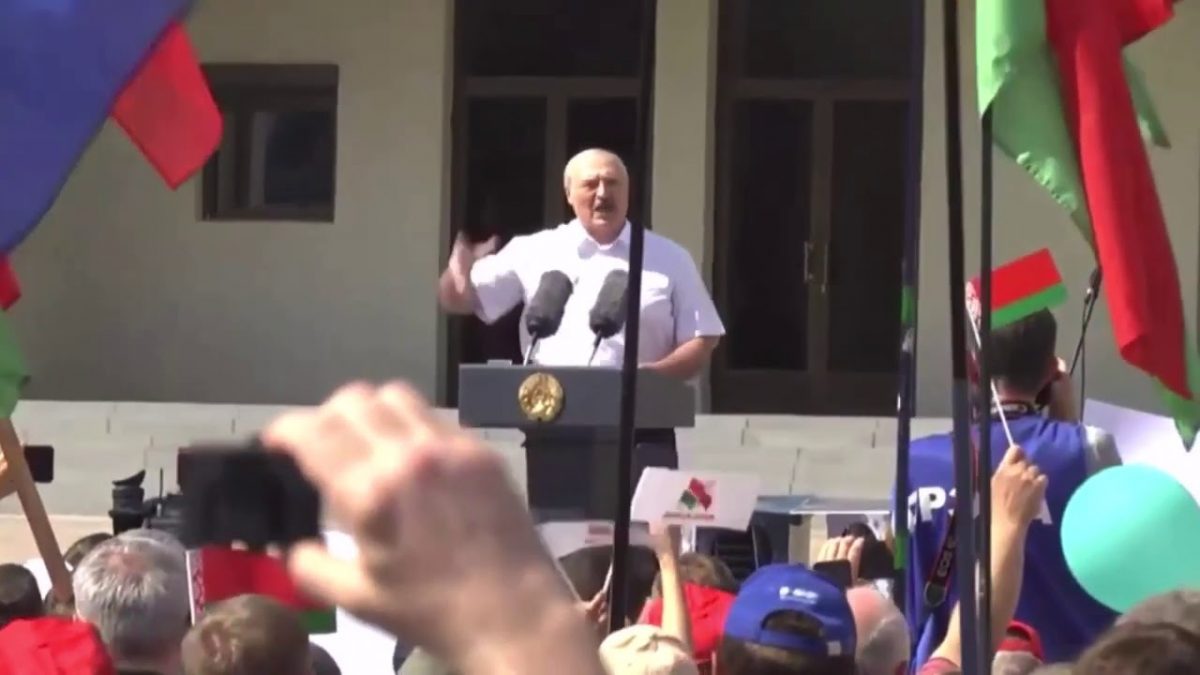 Președintele Aleksandr Lukașenko vorbește la mitingul susținătorilor lui, duminica trecută/ Foto: wotrend.ru