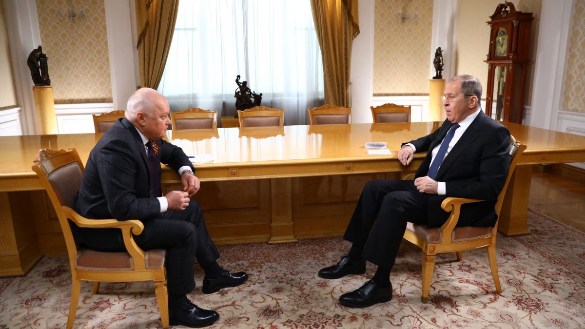 Moscova. Sediul Ministerului Rus de Externe. Ministrul de Externe, Serghei Lavrov (dreapta), acordă un interviu directorului general al Agenției ”Rossiya Segodnya”, Dmitri Kiselev/ Foto: RIA Novosti