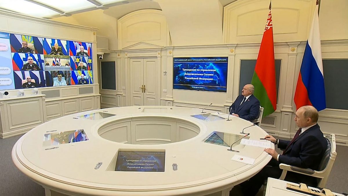 Președintele Vladimir Putin, alături de președintele belorus, Aleksandr Lukașenko, în timpul exercițiilor Forțelor de descurajare strategică, 19 februarie 2022/ Foto: TV Zvezda