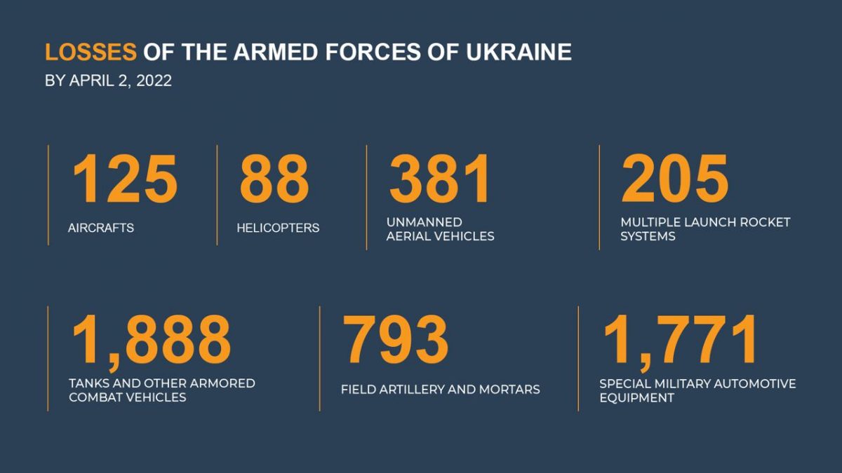 El a adăugat că de la începutul operațiunii speciale, Forțele Armate Ruse au distrus 124 de avioane, 84 de elicoptere, 381 de vehicule aeriene fără pilot și 1.882 de tancuri ucrainene.