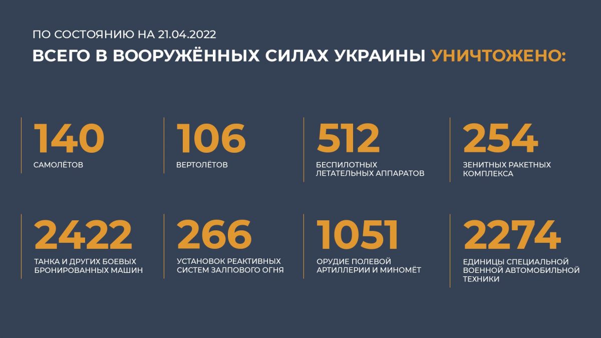 Un bilanț total al pierderilor Fortelor Armate ale Ucrainei pentru ziua de 21 aprilie 2022/ Foto: Ministerul Apărării al Rusiei