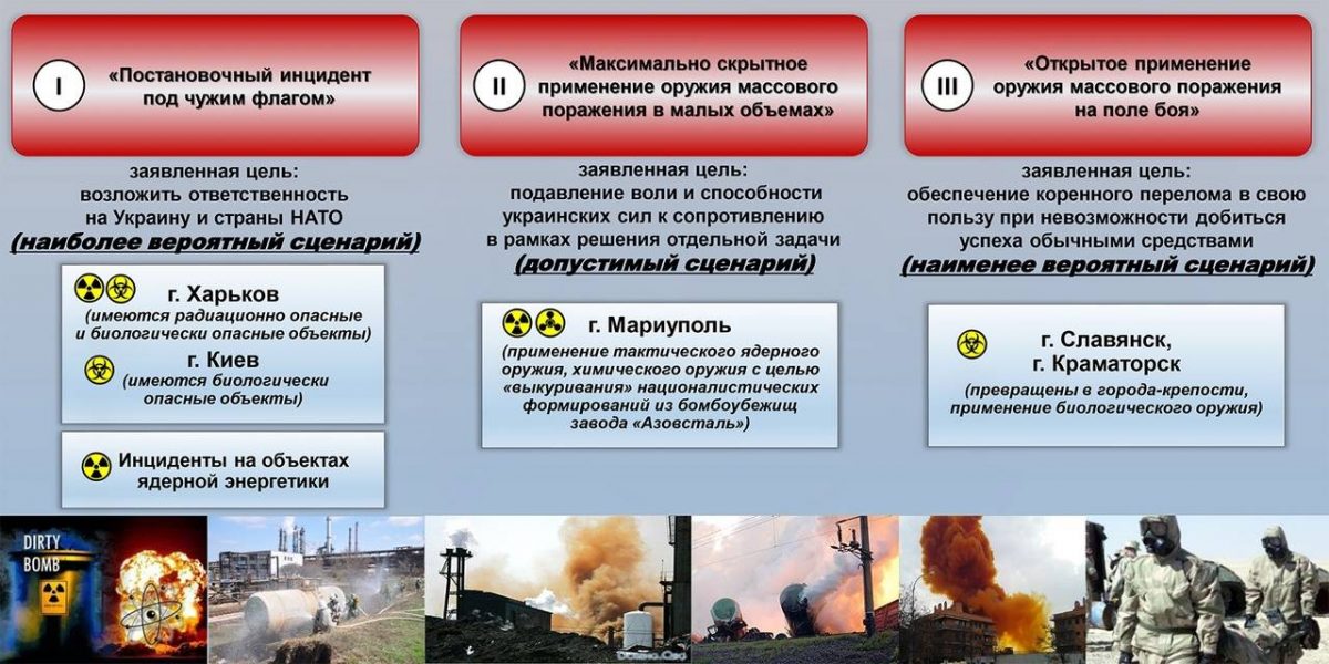 Un astfel de scenariu este planificat să fie pus în aplicare la unitățile chimice și biologice din Harkov și Kiev. Nu este exclusă o provocare la instalații nucleare, în primul rând la centrala nucleară din Zaporojie, care se află sub controlul Federației Ruse. Așadar, pe 21 aprilie, la punctul de control al trupelor Gărzii Naționale, a fost oprit și întors în orașul Zaporojie un convoi de 10 vehicule cu încărcătură periculoasă, care se îndrepta spre centrala nucleară.