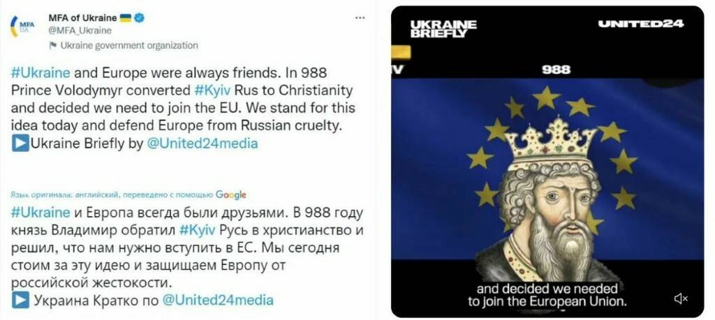 ”În anul 988, cneazul Vladimir a convertit Rusia Kieveană la creștinism și a decis că noi trebuie să aderăm la UE”, scrie pe pagina MAE ucrainean.