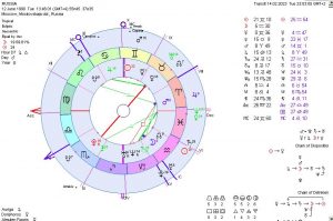 Luna martie este foarte importantă pentru întreaga planetă – Pluton intră în Vărsător și dă o probă a ceea ce ne așteaptă în viitor, iar Saturn intră în Pești (la 7 martie) și ne întreabă (pentru 2 ani și jumătate de-acum încolo) cum stăm cu compasiunea și credința, care este relația noastră cu cei de lângă noi, dar și cu Divinitatea. Pentru Rusia, martie va fi o lună foarte intensă – Marte intră în casa a X-a a instituțiilor țării și a reputației, imaginii, dinamizând energiile; este posibil să se creeze noi alianțe, unele cu caracter surpriză. Apoi, Neptun intră în casa a VII-a, reconfigurând relațiile contractuale în materie de gaze și petrol pentru mulți ani de acum înainte. Pluton va face trigon cu Mercur natal din casa a IX-a a relațiilor diplomatice, aspect pe termen lung, care predispune la a schimba atât diplomația rusă cât și felul în care va fi percepută Rusia în lume.