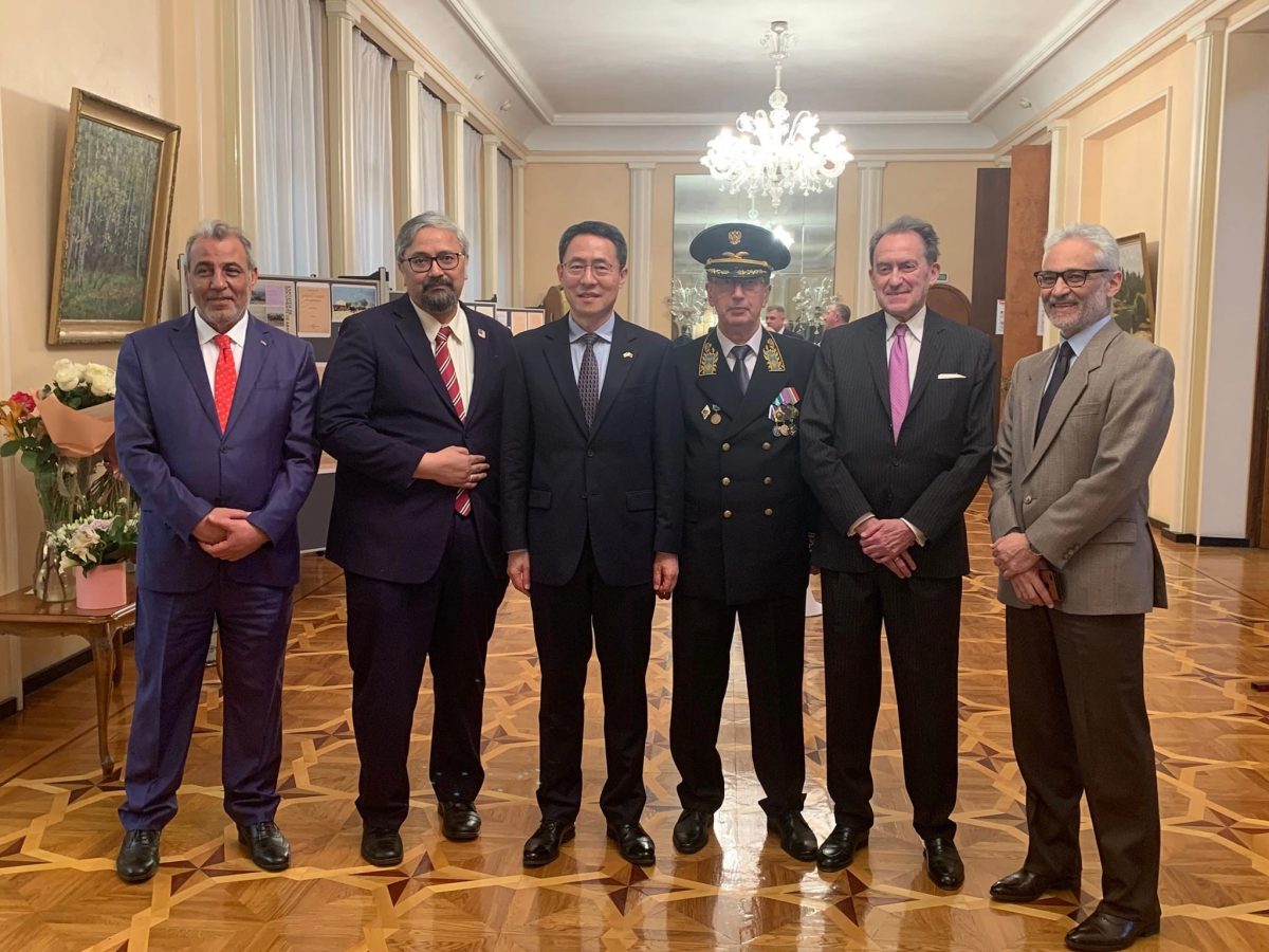 Ambasadorul rus în România, Valery Kuzmin (al treilea din dreapta), împreună cu membrii corpului diplomatic din București/ Foto: Biroul de presă al Ambasadei ruse