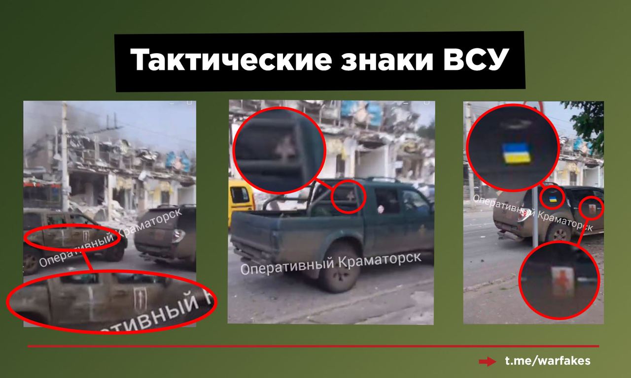 Pe camionetele din fața hotelului se văd limpede însemnele tactice ale armatei Ucrainei: cruci și rune (în imagini). Crucea albă este principalul însemn tactic al Forțelor Armate ale Ucrainei, iar runele sunt însemnele tactice ale unităților. De asemenea, a fost observată o mașină a serviciului medical al armatei ucrainene. Astfel de vehicule nu vin după civilii răniți: chiar și în orașele situate în apropierea locurilor unde se desfășoară acțiuni de luptă, civilii sunt preluați de ambulanțe obișnuite.