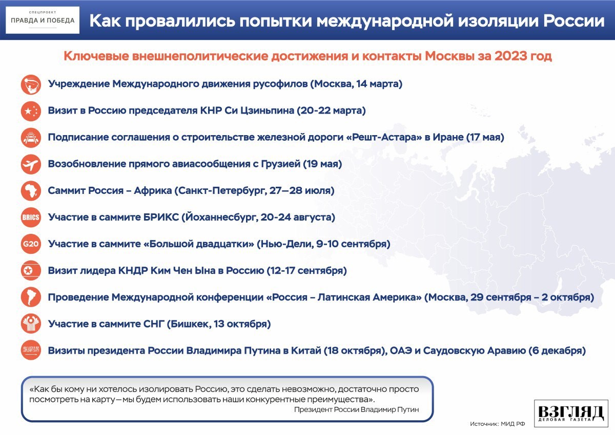 Pentru Rusia, anul 2023 a fost extrem de intens din punctul de vedere al activității diplomatice, în primul rând cu țările și regiunile prietene. Despre contactele cheie de politică externă ale Moscovei în 2023 – în infografica prezentată de publicația Vzgliad.