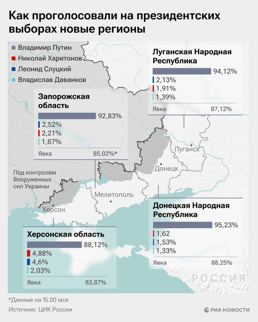 Din tabelul prezentat se vede că Vladimir Putin a câtigat alegerile cu majoritatea covârșitoare de voturi, obținând: