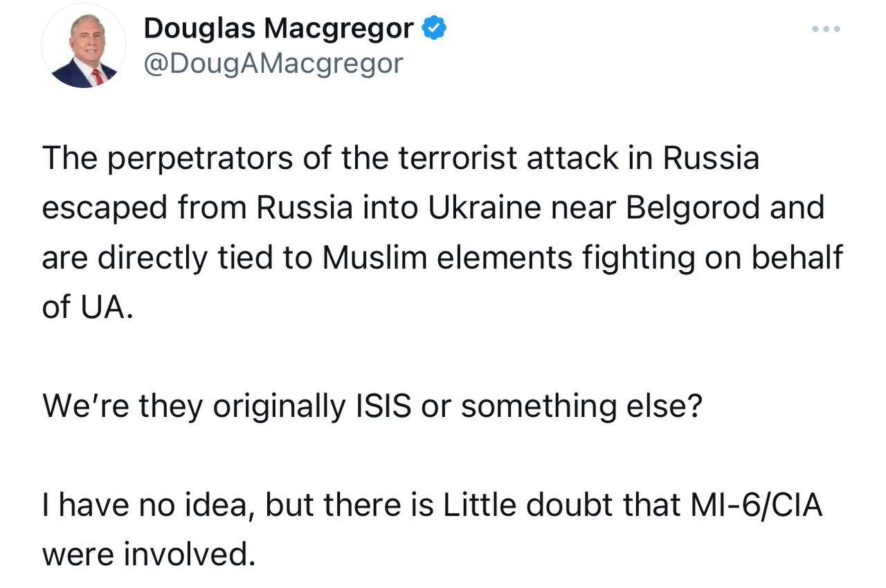 Fost consilier al lui Donald Trump, colonelul armatei americane Douglas Mcgregor, a comentat atacul terorist de la Crocus City Hall, pe pagina sa de pe rețeaua X.