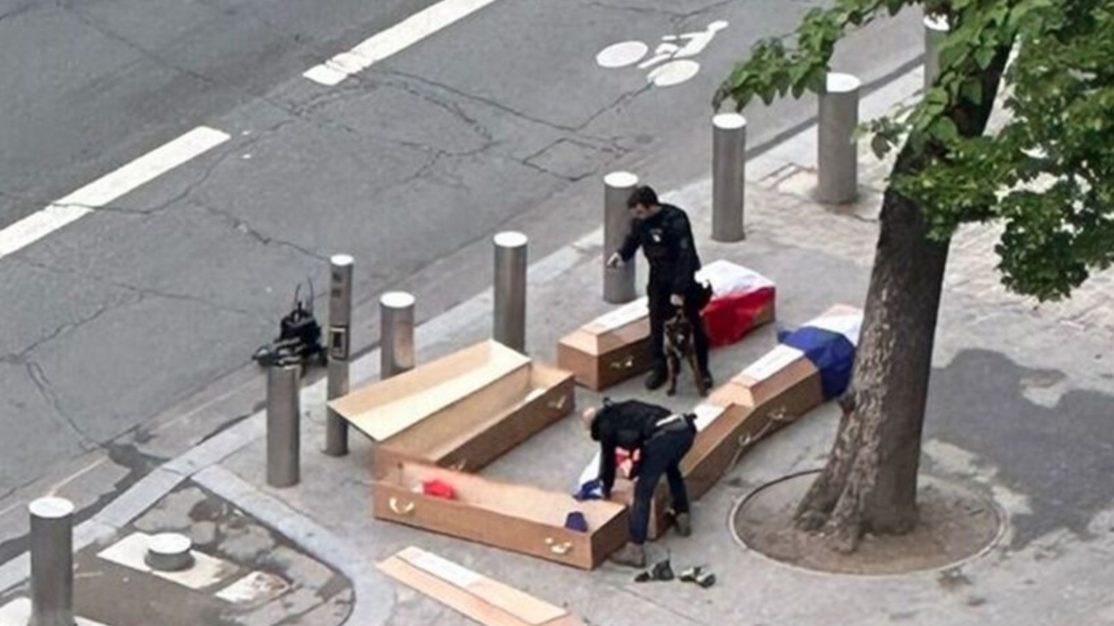 Infractorii au fost identificati grație camerelor de monitorizare video: nu departe de Turnul Eiffel parchează o dubă de culoare albă, din care coboară doi oameni, care lasă pe trotuar sicriele și bannerul. Șoferul camionetei a fost reținut nu departe de locul incidentului; el susține că a venit în ajun din Bulgaria și că i s-au plătit 40 EUR pentru a lăsa alți doi bărbați și încărcătura. Cei doi suspecți au reușit inițial să scape, dar au fost găsiți în autogara Bercy, unde încercau să ia un autobuz spre Berlin.