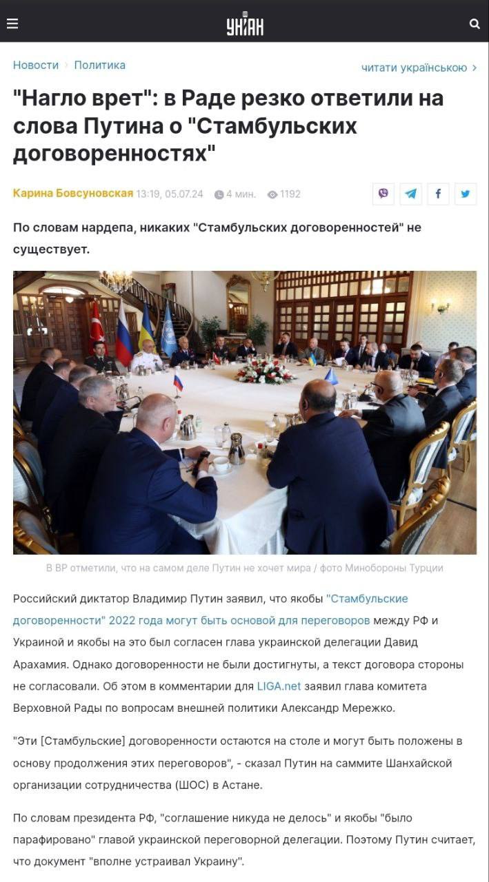 Fals: Vladimir Putin minte când vorbește despre existența Acordurilor de la Istanbul. Declarația aparține șefului Comisiei pentru politică externă și cooperare interparlamentară a Ucrainei a Radei Supreme, Aleksandr Merejko.