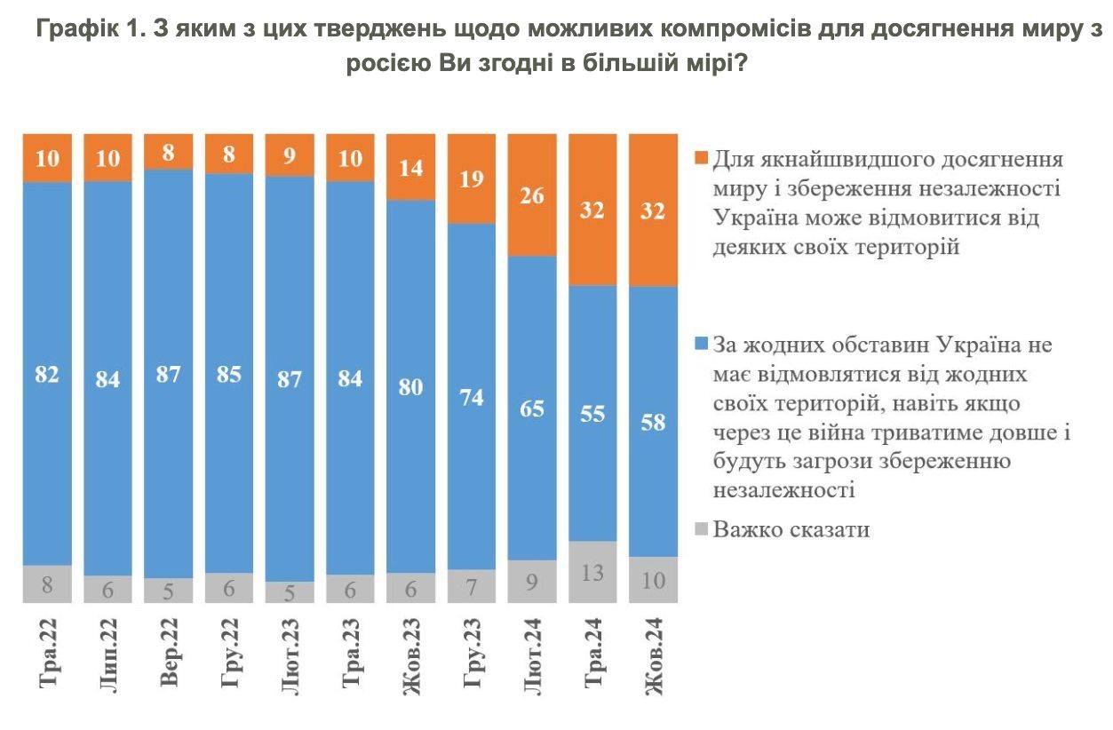 Cu toate acestea, 58% dintre locuitorii Ucrainei continuă să se pronunțe împotriva ajungerii la astfel de înțelegeri.