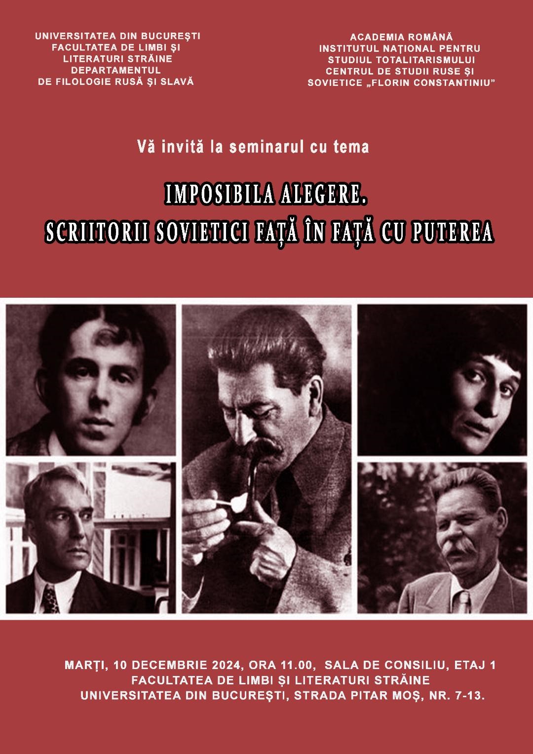 Filologii rușiști de la Universitatea din București, în colaborare cu Centrul de Studii Ruse și Sovietice ”Florin Constantiniu” (CSRS) din cadrul Institutului pentru Studiul Totalitarismului, au organizat, în incinta Facultății de limbi și literaturi străine, conferința cu tema: „Imposibila alegere. Scriitorii sovietici față în față cu puterea”. Comunicările prezentate s-au referit cu precădere la perioada stalinistă și cea imediat următoare după moartea lui Stalin.