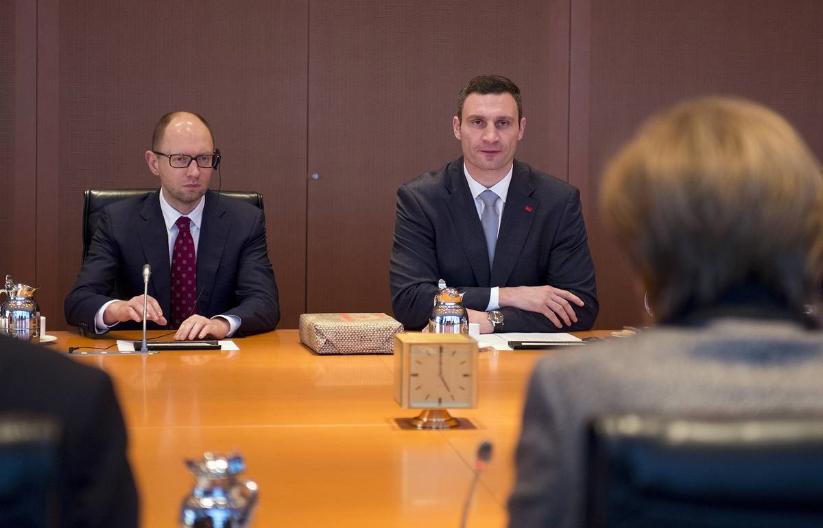 2014. Berlin. Membrii opoziției ucrainene, A.Iațeniuk și V.Kliciko, la conferință de presă, în urma întâlnirii lor cu cancelarul german A.Merkel/ Foto: AP