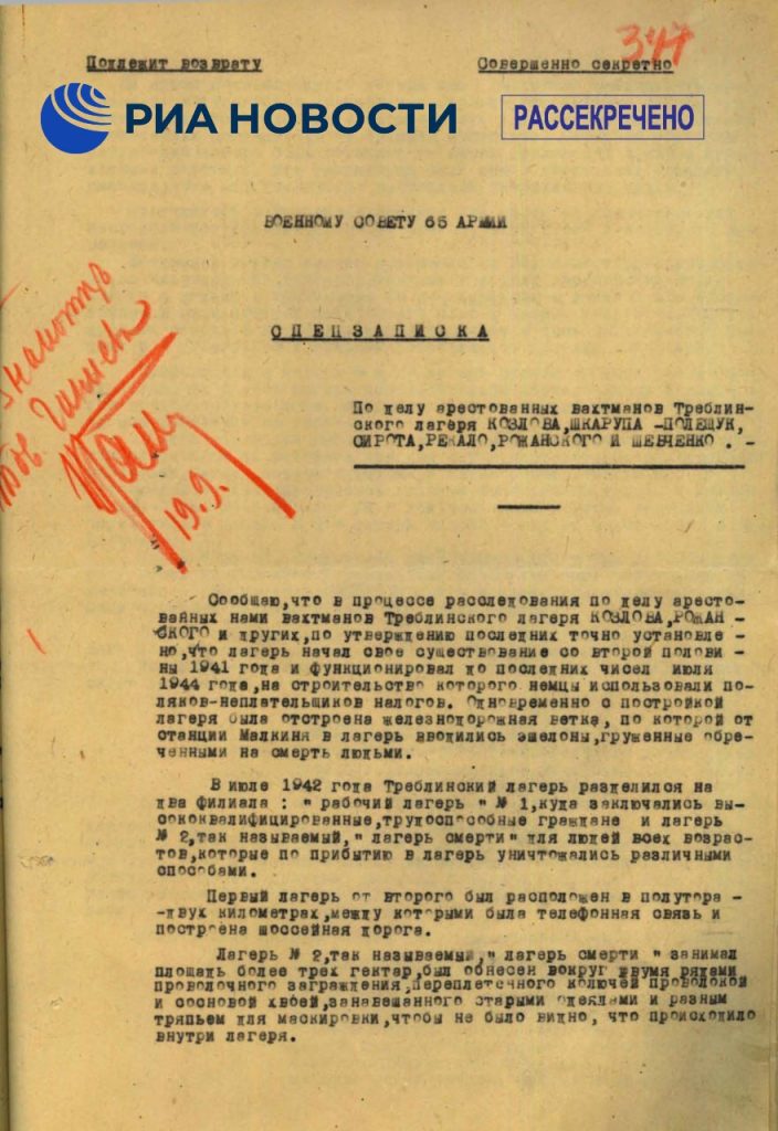 „În acest lagăr soseau zilnic din Germania, din Polonia, Cehoslovacia, Bulgaria, Franța și din alte țări europene, trenuri cu oameni în număr de 3-4 eșaloane”, se spune în nota specială a colonelului Trapeznikov despre călăii arestați.
