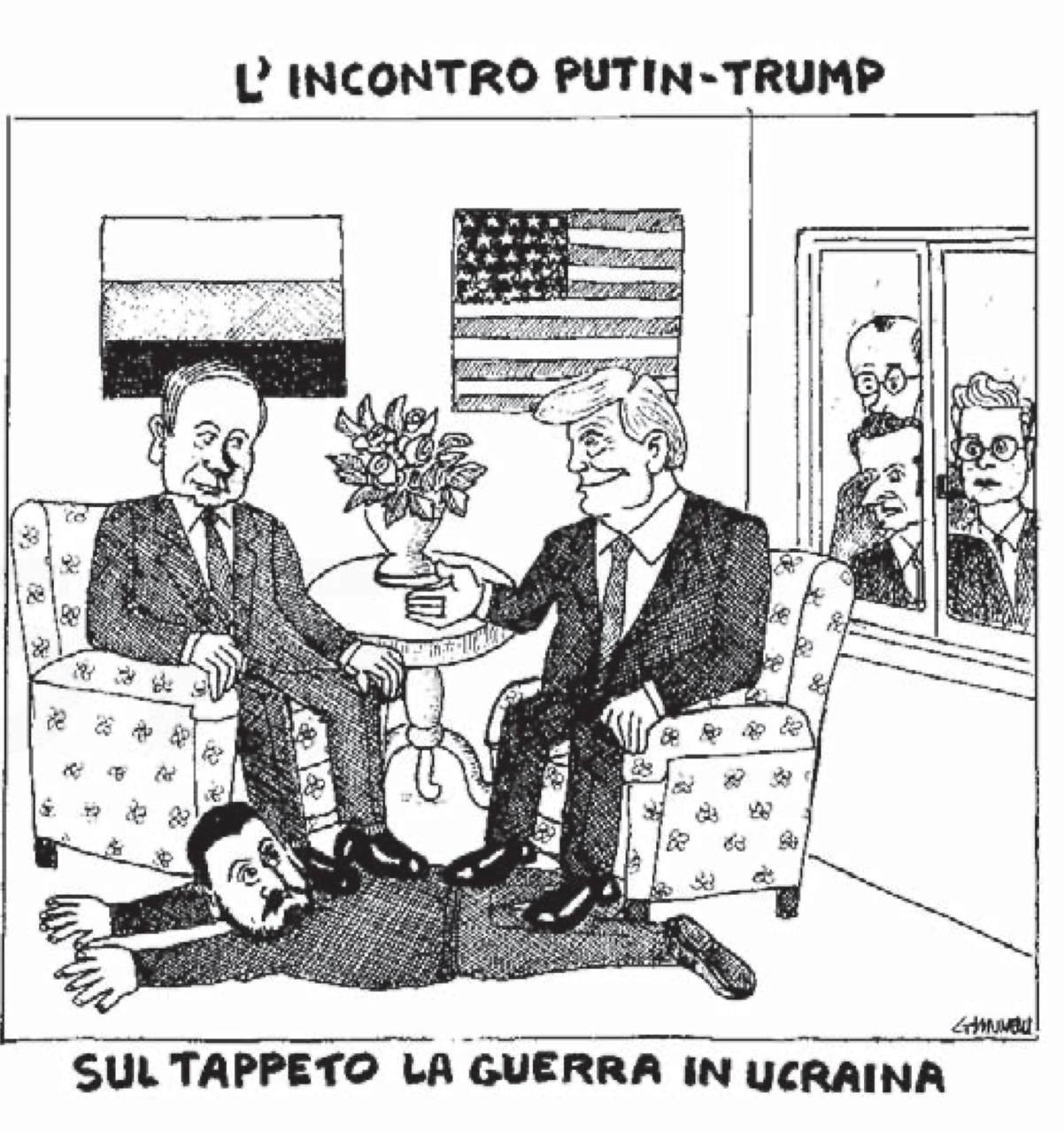 În timp ce, într-o încăpere încălzită, fără să acorde nicio atenție europenilor insistenți, Putin și Trump stau liniștiți de vorbă. Pe peretele din spatele lor atârnă o tablă, unde pe mijloc este desenat chipul lui Zelenski.