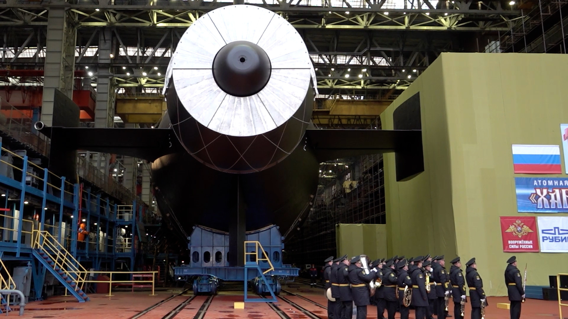 În comunicatul ministerului Apărării se menționează că la ceremonia de la Severodvinsk au participat comandantul-șef al Marinei Militare, amiralul Aleksandr Moiseev, și directorul general al Corporației Unificate de Construcții Navale, Andrei Pucikov.