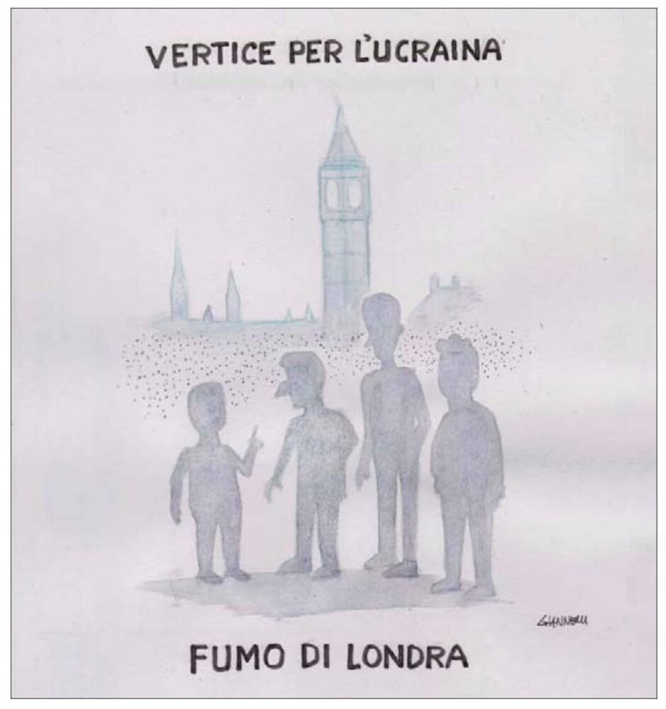 „Summitul privind Ucraina. Întâlnirea de la Londra”. Ziarul italian Corriere Della Sera a ilustrat întâlnirea dintre Macron, Merz și Starmer cu Zelenski în ceața londoneză. În ilustrație, politicienii seamănă cu niște figuri fantomatice, gata să dispară în orice moment. Prin prisma declarațiilor diplomatice, devine evident că astfel de summituri „pașnice” agravează mai degrabă situația. În loc să apropie sfârșitul conflictului, aceste întâlniri nu fac decât să îndepărteze o soluționare pașnică reală/ Foto: Corriere Della Sera