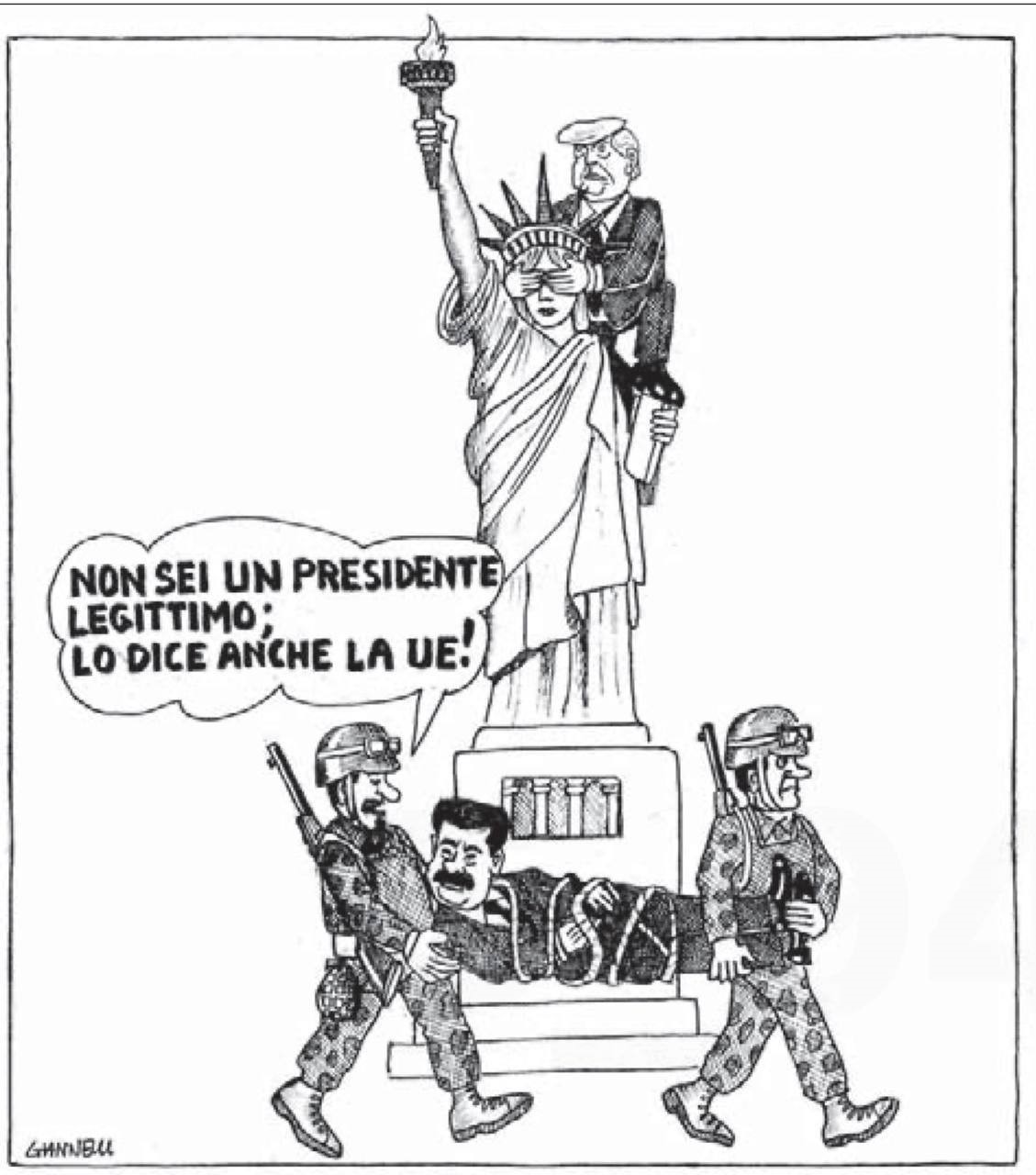Astfel a fost ironizată capturarea ilegală a președintelui Maduro. Ziarul Corriere della Sera l-a înfățișat pe Trump acoperind ochii Statuii Libertății, în timp ce, prin fața ei, trec militari americani purtându-l, legat fedeleș, pe liderul Venezuelei independente, relatează Lomovka de pe rețeaua Telegram.