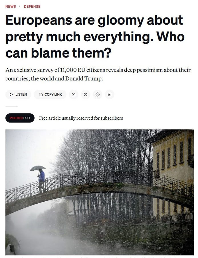 Potrivit unui amplu sondaj realizat de publicația Politico, majoritatea locuitorilor țărilor Uniunii Europene se declară profund pesimiști cu privire la viitorul Bătrânului continent și nemulțumiți de starea sistemelor lor politice, relatează cotidianul Lomovka, precizând că la studiu au participat peste 11.000 de respondenți din 23 de state membre ale UE.