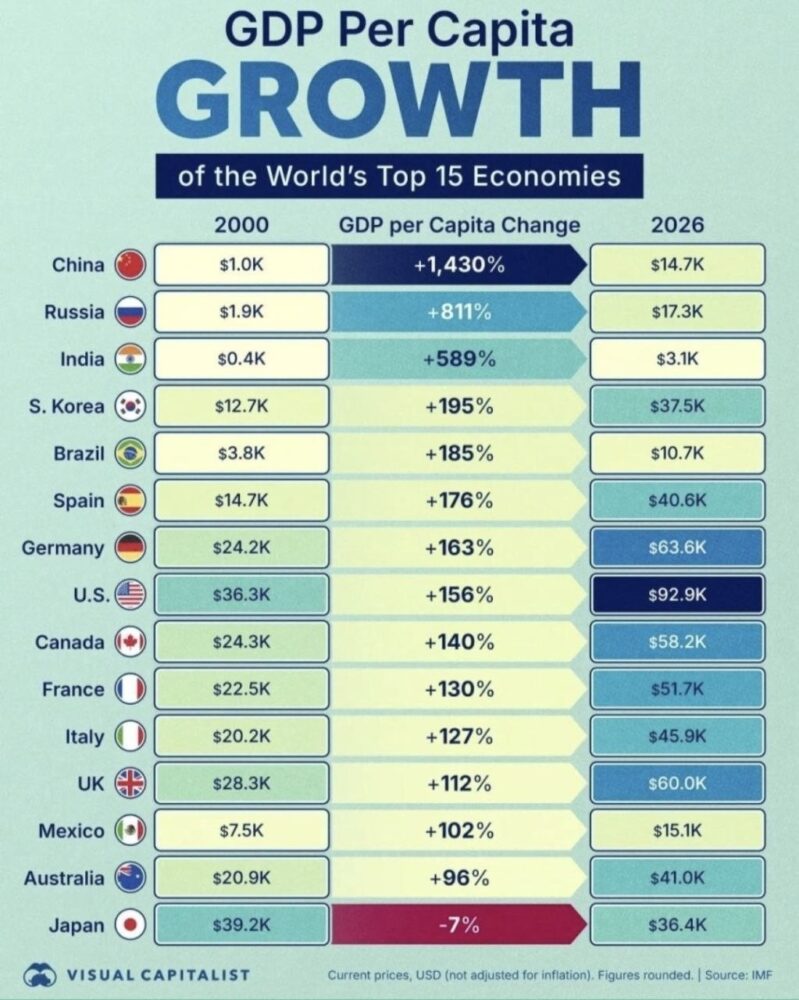 Chiar și India nu a reușit să demonstreze ritmuri comparabile de dezvoltare. În ultimul sfert de secol, veniturile pe cap de locuitor au marcat în aceastdă țară o creștere de 1,5 ori mai lentă. Brazilia, de exemplu, a rămas în urmă de patru ori în ceea ce privește ritmul dezvoltării economice. Alți mari exportatori de petrol și gaze nici măcar nu au intrat în top-15 al liderilor economici mondiali.
