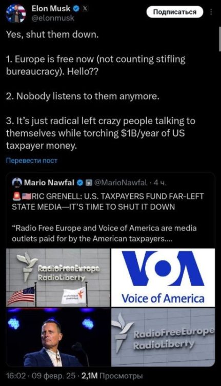 Despre cele două posturi, Musk a spus că sunt nebune și că nu sunt ascultate Șeful Departamentului pentru eficiență guvernamentală (DOGE) al SUA, omul de afaceri american Elon Musk, a îndemnat la închiderea posturilor Radio Free Europe/Radio Liberty și Voice of America, unde, potrivit spuselor sale, lucrează „nebuni radicali de stânga care vorbesc cu ei […]